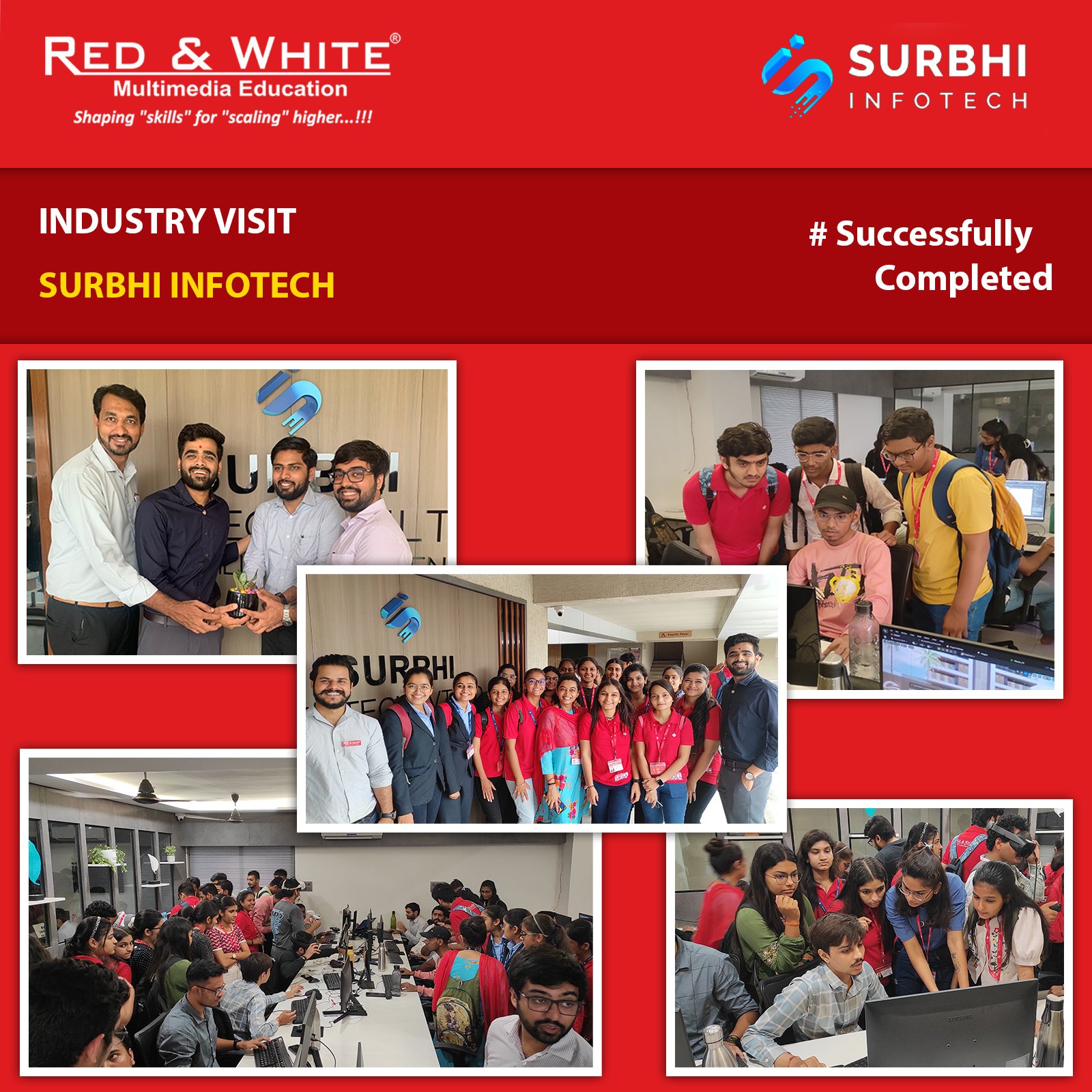 We successfully completed an industry visit to Surbhi Infotech, organized by Red and White Multimedia. This tailored visit was designed for animation and 3D students, offering a firsthand exploration of the animation industry.